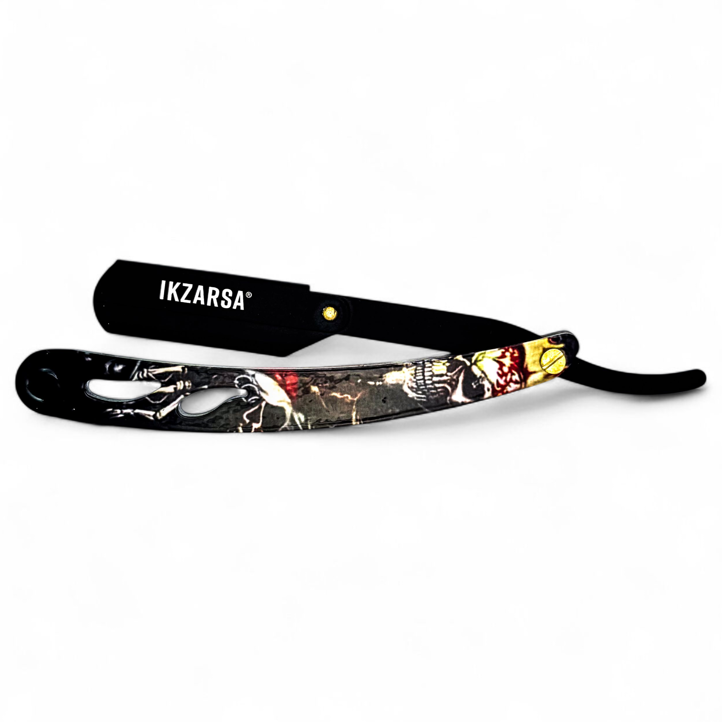 Barber Steel Razor – Skeleton Print Handle & Matte Black Blade | Professional & Stylish IKR-1019