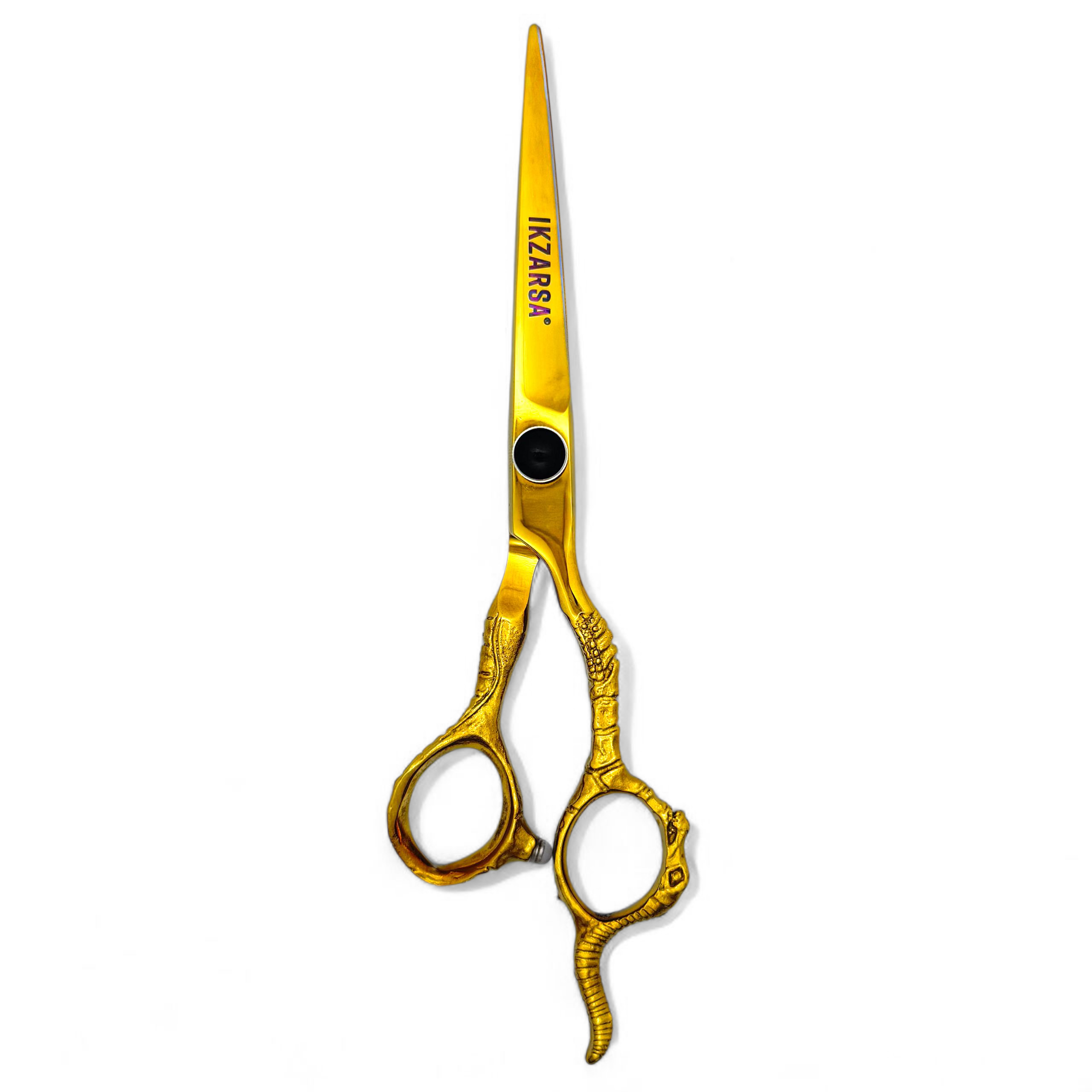 The Professional Gold Ergonomic Dragon Hair Cutting Scissor is crafted from premium Japanese stainless steel to ensure exceptional sharpness, strength, and durability. Designed with a razor-sharp edge, it delivers smooth and effortless hair cutting for professional use. The ergonomic handle provides excellent comfort and control, helping reduce hand fatigue during long working hours. Featuring a stylish gold finish with a distinctive dragon design, this 6.75″ right-handed scissor is an ideal choice for professional barbers and hairstylists who demand precision, performance, and a premium look in their tools.