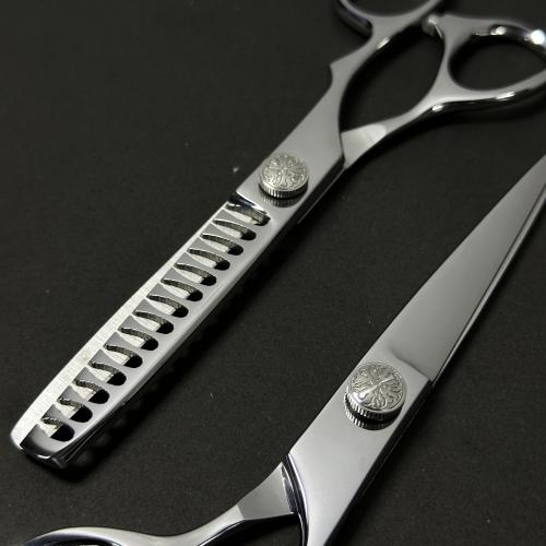 The Professional Hair Cutting & Thinning Ergonomic Scissors 6.5” set is expertly designed for professional barbers who require versatility, precision, and durability. Crafted from premium Japanese stainless steel, this pair offers exceptional strength, long-lasting sharpness, and resistance to corrosion for daily professional use.